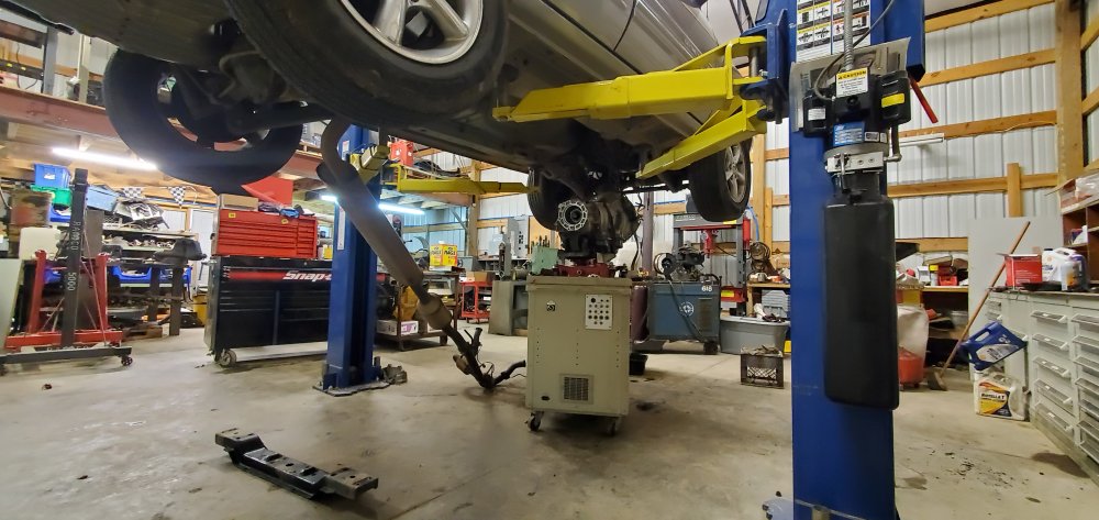 That would have been waaaay harder. I spent 30-40 minutes screwing around trying to get the exhaust loose. Header bolts came right off and it was loose at the joint, but the ubolt had deformed it too much. I finally gave up and just dropped it down to the floor. Bellhousing bolts were easy. 3 extensions on an impact and about 1 minute for all the rear facing ones.I find it easier to just pull the motor/trans/case as one unit. No fighting bell housing bolts and no trying to line up everything on the way back in. But, I don't have a lift either.
