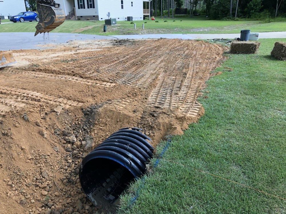 Couple more from around the house over the weekend. Trenching to bury 4" gutter lines from the backside of my house that will feed into a catch basin for run-off and ultimately into a 6" line and dumping on the lower side (front driveway) of my house.