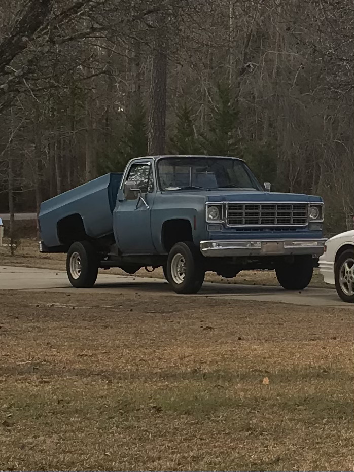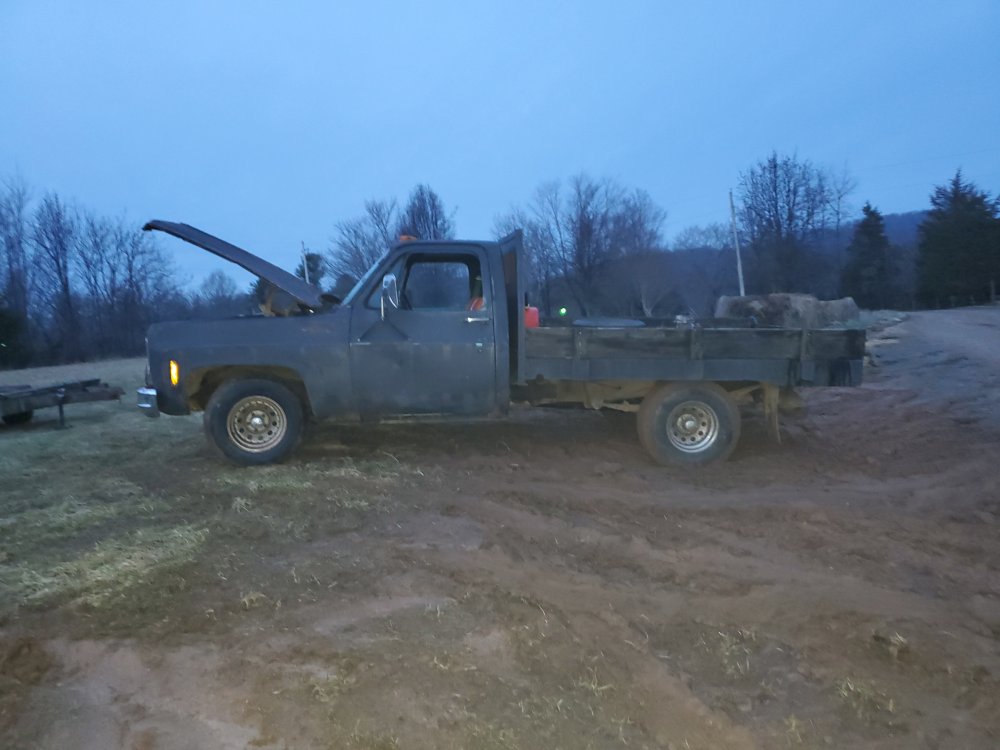 Mild 350, headers and I think glass packs. Heavy (af) steel flat bed with wood sides and electric hydraulic dump.