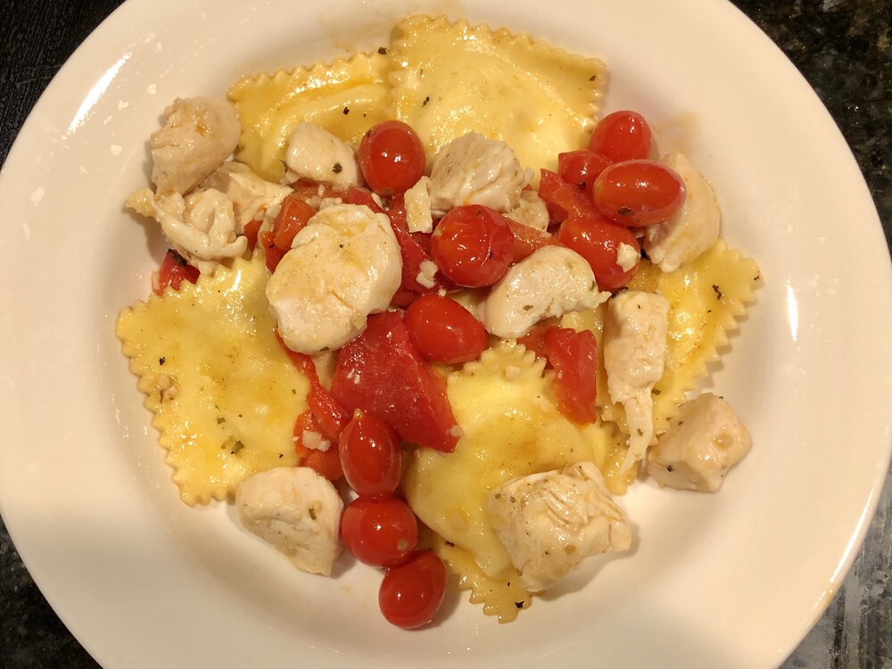 I bought a small Blackstone. I’ve done several things on it now, but this was awesome. Found it on YouTube, so tried it and liked it. Gluten free ravioli from Earthfare (I’m the one that can’t have gluten), chicken, tomatoes, jar of roasted red peppers, Olive Garden Italian dressing, throw it all on the Blackstone.