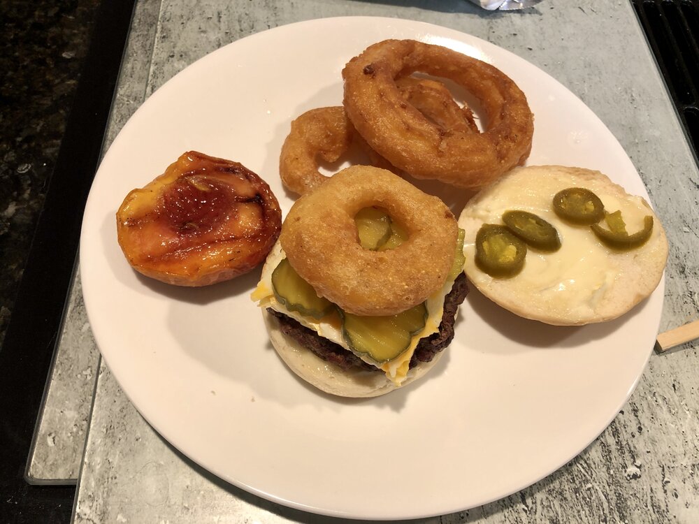 Last night I wanted something with our burgers besides fries. So I found a recipe for homemade gluten free onion rings. It rocked! Even the kids thought they were great! And it’s always good to throw some peaches on the charcoal grill while it’s still hot. The down side to the onion rings is my proficiency in the kitchen. There was stuff all over the counters by the time I was finished cooking.