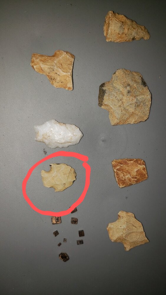 And here others I found as a kid at either my grandparents field when they plowed it or at boy scout camp. The small square peices we called "Indian money" not sure if that is correct or not.