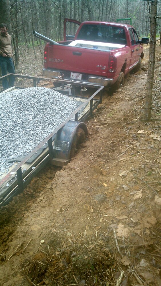 if yall shovel all of that gravel off the trailer you can get the truck/trailer unstuck. Then you can shovel the rock back on the trailer and do it again :lol: