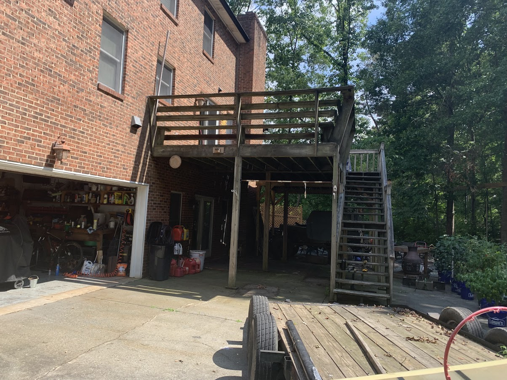 35yr old deck(14'x20') that never saw an ounce of maintenance or repair. I'm doing the tear-down myself. The new deck will have Trex, electrical to the underside, and upgraded joists to eliminate the middle posts. The plan will be to waterproof the underside of the deck for additional parking/play area for the girls. Plan is to start building 8/1 so I have to have this entire thing gone by then. I've worked on it for about 4 hours and have all the railings down plus a few deck boards. My plan is rip all the deckboards off, then pull all the joists, then its just the posts and the sistered 2x8s.