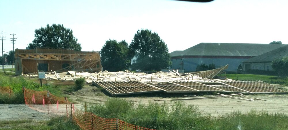 This is a start of How my Yesterday, went! As I have been having more back problems, but working also. First, I make 1 run to Mooresville, which turned into 3 trips. Did the Big Bad Wolfe, do this? the scene is aged, but the first time I'm seeing it. Wood frame building collapsed.