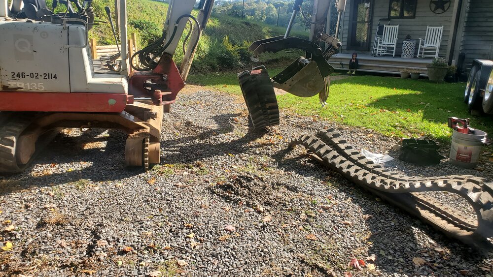 Using the chain on the thumb to pull the track over the sprocket made it super easy. Hardest part was getting the grease relief loose and spun out enough to release the tension.