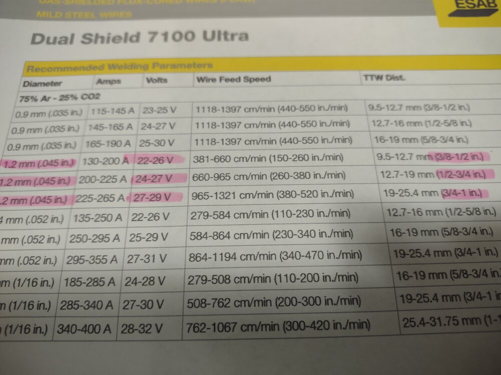 I run .045 dual shield at home, at 26-27v when I worked at Toner machine shop and the welder was out on a week long bender I would get to weld up fixture tombstones. Usually 1.5" plate with massive bevels, run .062 solid at 28-29v and all the wire speed, tack a straight edge to hold the gun, cover every sq inch of skin stand back and put down a 3/4-1" weld in a single pass. Would go through a set of gloves in no time