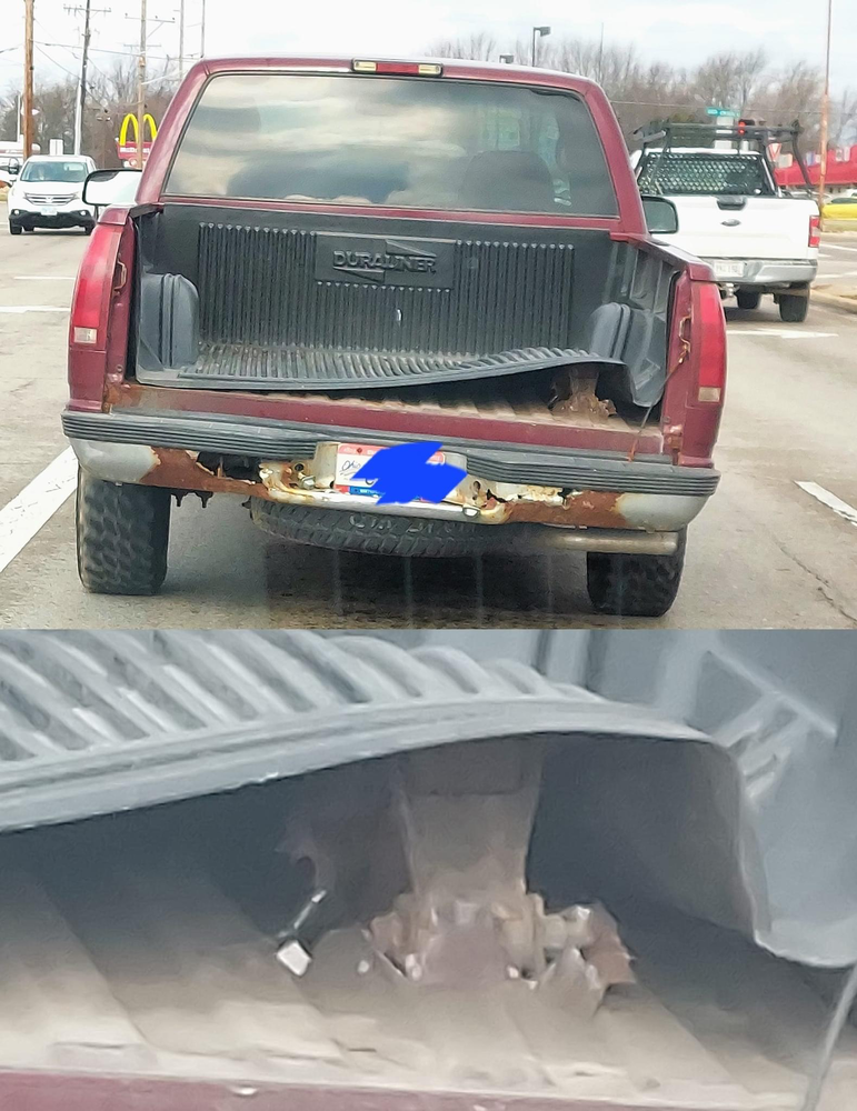 Sounds like my father-in-laws dodge......his bed and hitch are the only thing keeping it from folding in half. Hauled a full load of firewood on it a couple weeks ago.I saw a Dodge Ram today, that was fast approaching that state of decay!