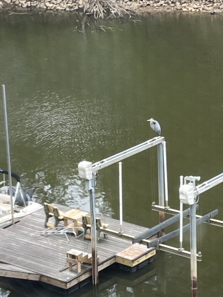 Mr. “Craps on Everything” is hanging out this morning. Great blue heron that lives in the cove. Dude drops bombs all over the dock and boat. Straight puddles. He pretty much ruined one of my bimini tops after dropping dooks on two separate occasions. It’s stained white now. Hoping one of the eagles around here will scoop him up and fly away.