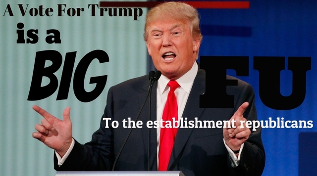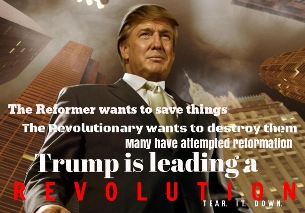Really? Do you really believe this?Trump is the Anti-status quo, a black eye to the "Jeb Bush must win" establishment. He isn't the perfect candidate, but the perfect one hasn't been born yet. Brash, unafraid and smart. He isn't the second coming of Perot, he is willing to tear it down. LET IT BURN