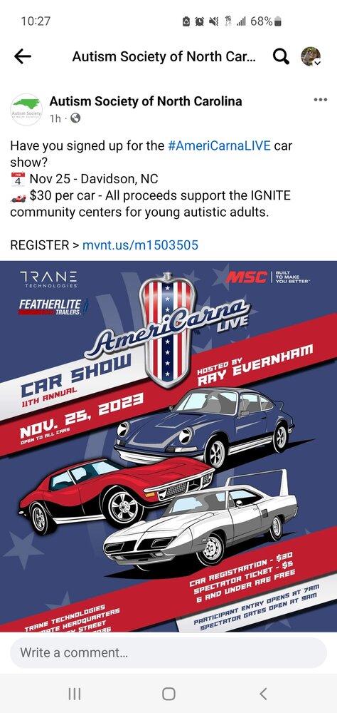 It's def a good show with a lot in attendance. Every kind of car and truck you can imagine. Yes CORE was invited and they even added a category called "Off Road" because the 4wd category was shiny nice Jeeps and TrucksAnybody else going? Me and the wife have started the yadkin county ASNC chapter, so we will be there! I know a group from C.O.R.E. went several years ago.