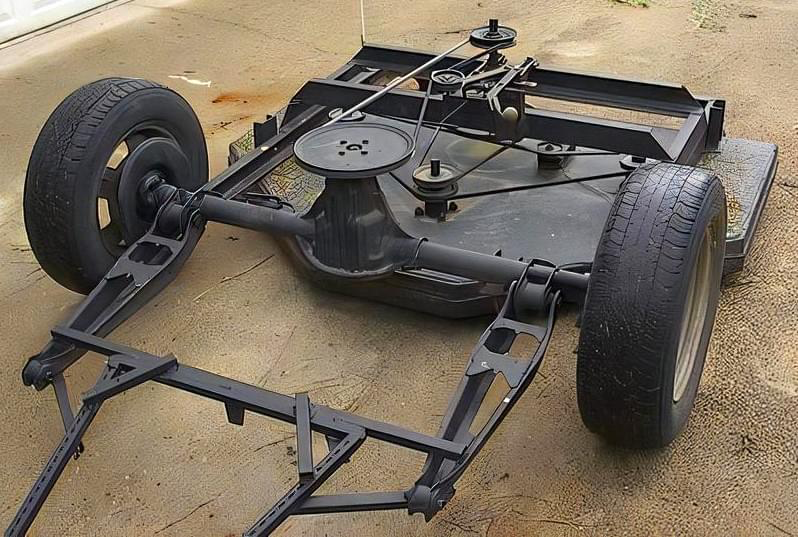 Figure about 1:3.5 on the axle, looks like 1:2.5ish on the pulleys, and no idea if there’s anything else where the shaft drops down. 27” tires from a car or small SUV, 25” blades from a 6ft mower, and 5mph travel speed. It’s pretty simple really: