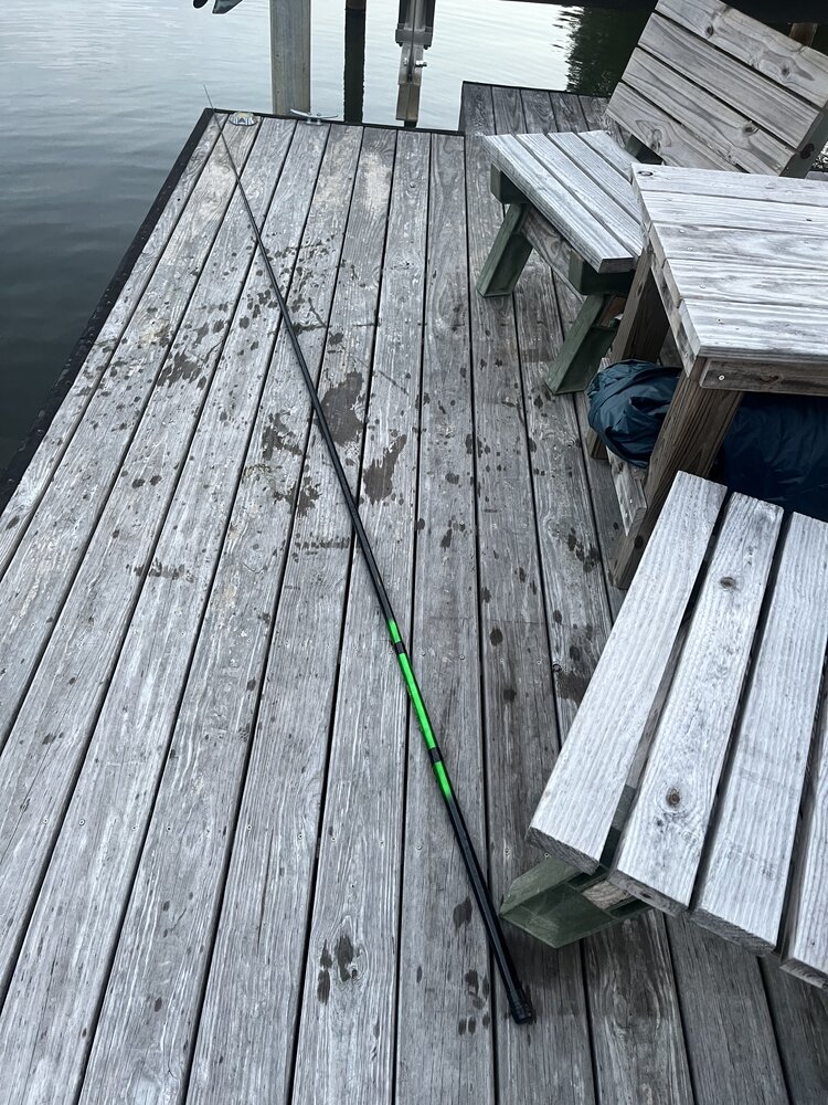 So I walk outside about 6:15 this morning. Took a look at the water, and I see what looked like something weird moving across the cove. I finally realized it was a fishing rod getting pulled around by something. I walked down to the dock and it finally came close enough for me to grab it. It was about a 10lb catfish dragging a cane pole. Got me a nice collapsible pole in the arsenal now. No picture of the fish. As soon as I got him on the dock the line broke and he flopped a few times and went back into the drink. Pretty cool way to start a Saturday.