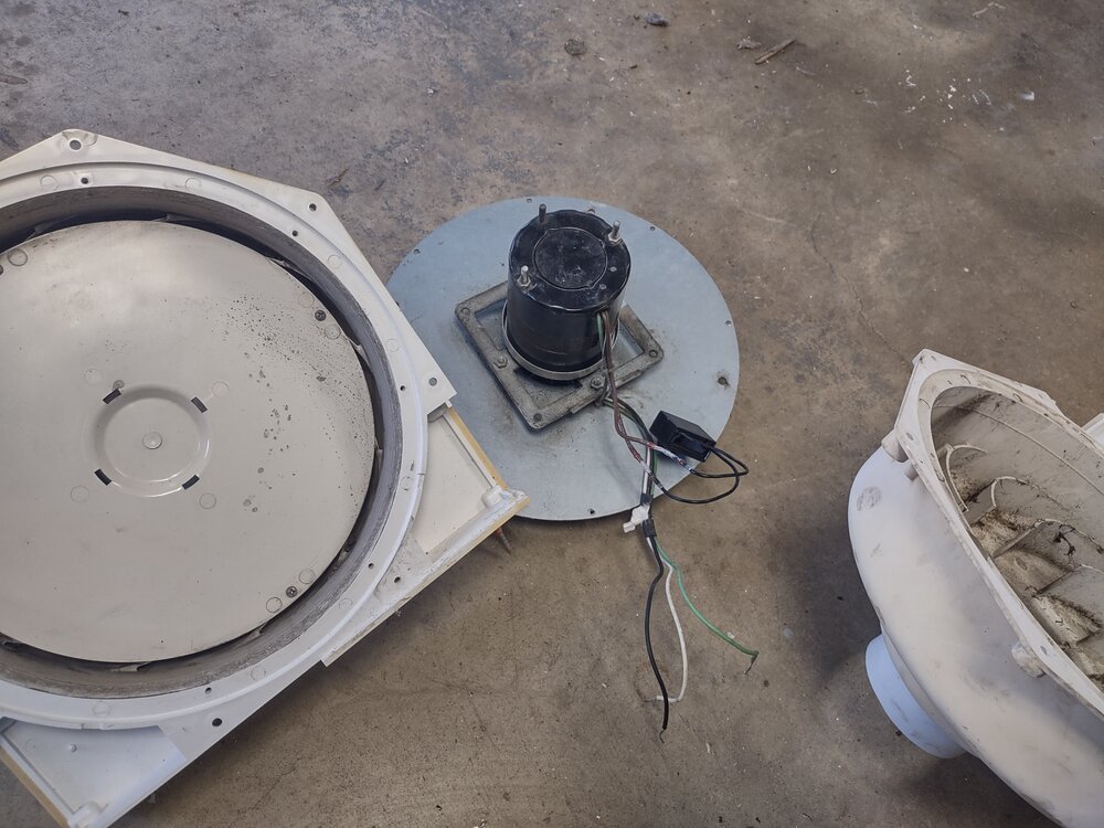 The nimrods that installed it ran the vent (which is just rectangular gutter) up to just past the roof line and left it open on the top facing vertically. Theoretically as long as the fan is running nothing will go in there... but magically, power being out and rain can happen at the same time. Imagine that! The fan housing had a lot of evidence of water and crud inside. I'm guessing thats what killed the capacitor. I'm making a vent cover for it to prevnt that happening again....