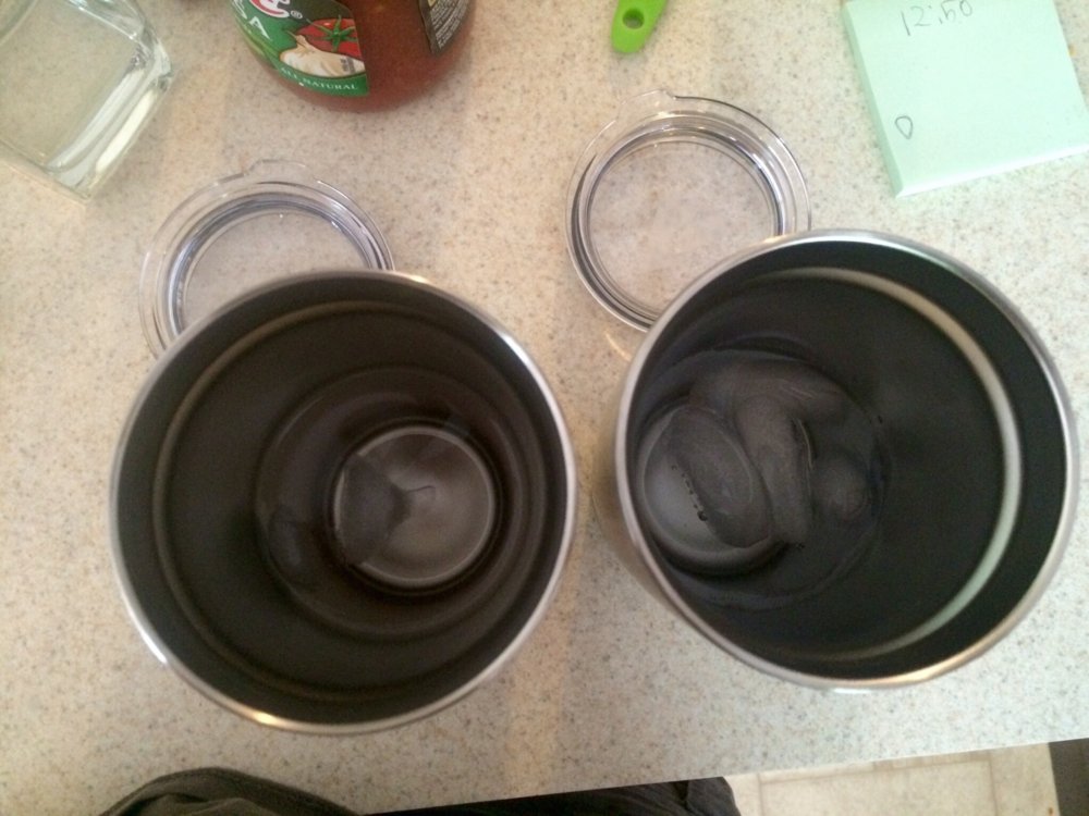 This pic was taken at the 3-hour mark. The lids stayed on the cups except when we took the picture. At 3 hours and 40 minutes, there was no more ice in the cup on the left.