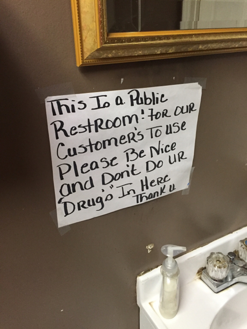 So this sign was put up after you left.... I see where this is going. Do we need to do an intervention.Yep same bathroom we hit a few weeks ago when we were there. It's a shame that the management is against them using drugs in their bathroom as much $$ they spend in their stores. Lol. The place was crawling with meth heads when we were there.