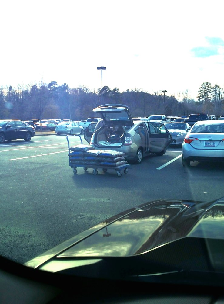], I spotted this customer. Guessing No truck, but he Did have a Prius. Folded down the back seats, & loaded probably 500# + of bag material!