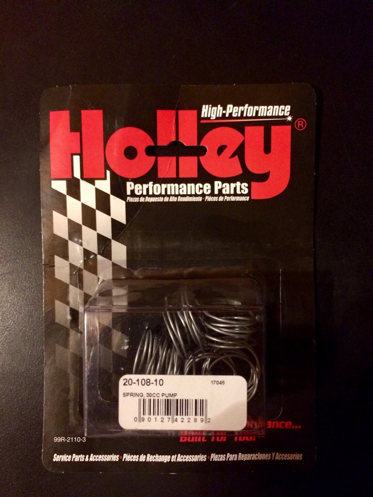 Damn...I just pulled the bowls off of my Holley to turn it into a throttle body for an EFI system...I'd have mailed you mine. Did you order them from a parts store? If you're in no rush, get it refunded and PM me your address. I'll send you mine.In my years of tinkering on cars I have never had to buy an accelerator pump spring. Today I spent $20 to buy ten because I needed one. Urgh.