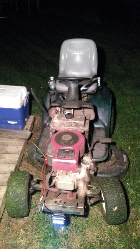 Rebuilt deck today and rewired. Now you can shut off by flip a switch and start with push button.. beat jumping it and turning off fuel to shut off. The light is fully obamafied. Plastic bag for insulation of twisted wire connections and gator clips to power.. awesome. That's what I bitch about when crap rolls in like that, solder and shrink is how I roll. Unless I'm home with nothing from the shop.