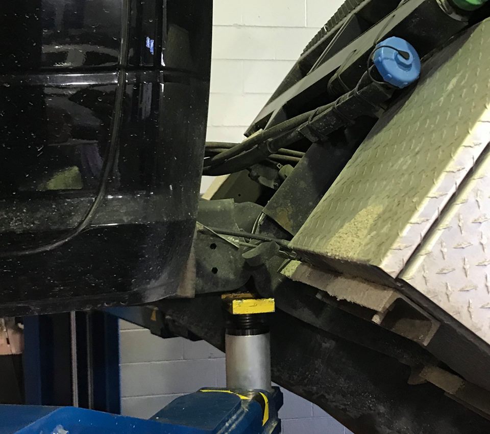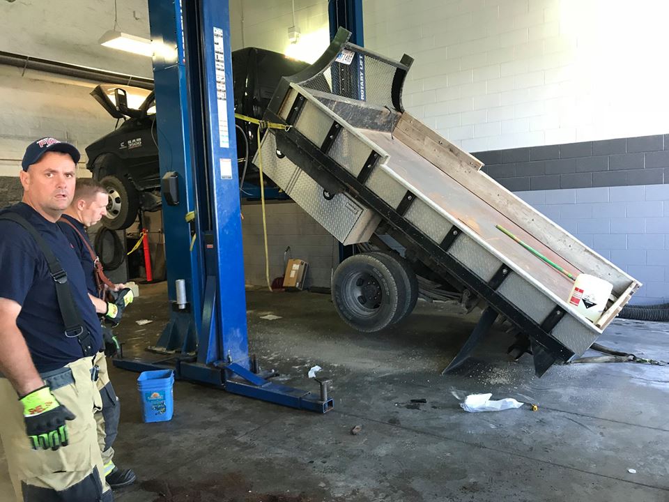 The frame section appears to have failed (ripped?) at the stress riser where that crossmember joins the rails (or maybe from where one of the bed mount brackets is attached), probably because the frame rail was loaded on the edge of the lift adapter right below that point. The frame rail flange has obviously buckled as well, so it was probably just a really bad place to load the frame rail in compression (reverse bending) instead of the tension. It's likely the normal case of chicked-or-egg; did the frame web rip first at the crossmember or bed bracket, causing the lower flange to buckle, or did the lower flange buckle and then cause the frame web to rip?
