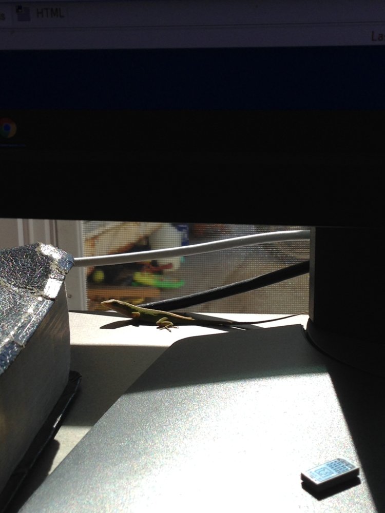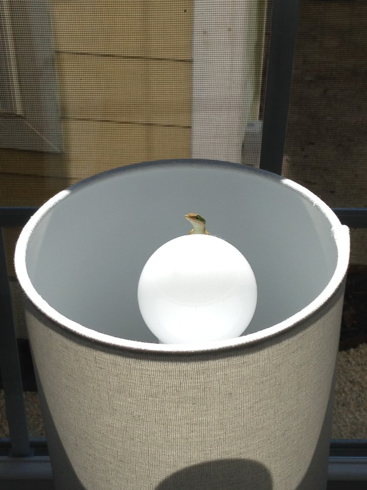 When we lived in Charleston, we'd go away for the weekend and 6 or 7 of them would squeeze between the screen edge and get trapped between the screen and glass while we were gone. I guess they were after insects or something. We'd come home and remove the screen to set them free. The first time I opened the window from the inside to shoo them out to the other pane, and then we had a lightning fast gecko inside the house for a day or two.