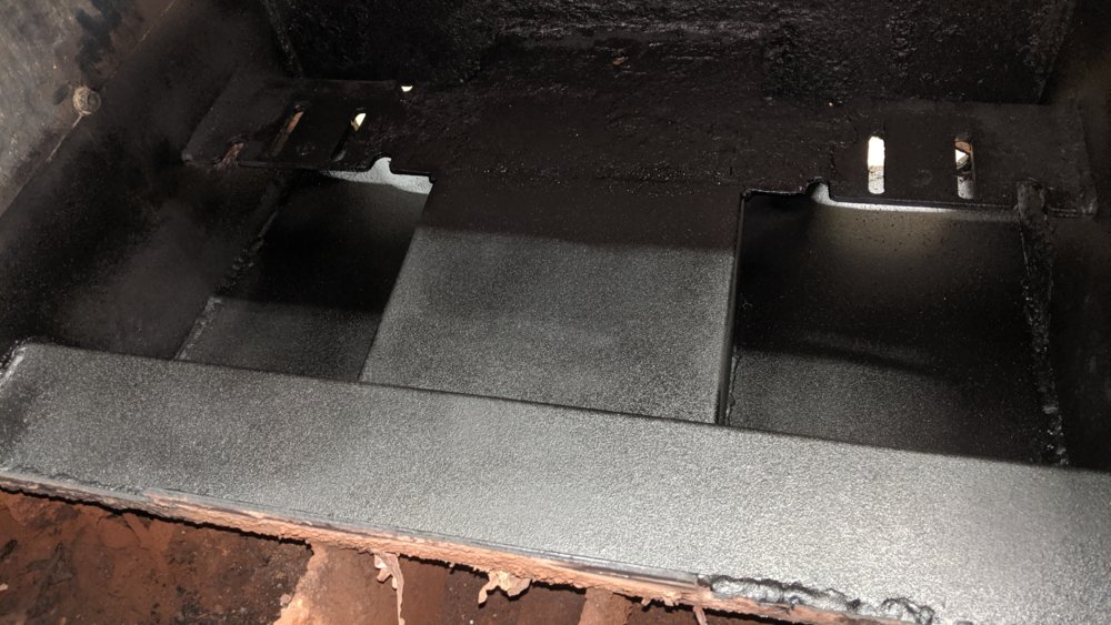 Got it shoehorned in there, boogered some welds together as best as I could (rusty metal is not the best workpiece) and shot it with a spray can of Herculiner from the car parts store to cover the crap welds and give it some traction.