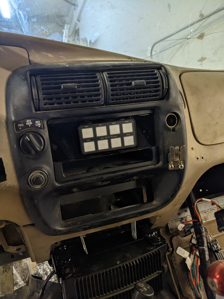 Ran the harness into the cab where it'll connect to the PCM. Mine is a Fox body kit, so it mimics it's routing. I'll have the relays, fuses, etc inside the glove box near the PCM. Got the SwitchPros mounted where the radio used to be. I used my superior fab skills and cut a piece of 2.375" x 7.25" flat stock and painted it black. It's the small touches that separate me from other hacks.