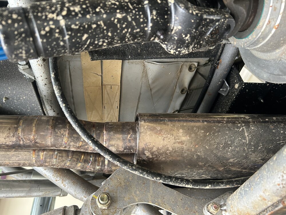 Little bit of hot seat going on in the buggy and I realized that I never properly answered your question. Better late than never. Here’s a picture of what Matt did with that giant sheet of DEI material I bought.Does that stuff attach to the bottom of your floor or do you make a bracket for it and let it "float" in the air gap between the muffler and the floor?