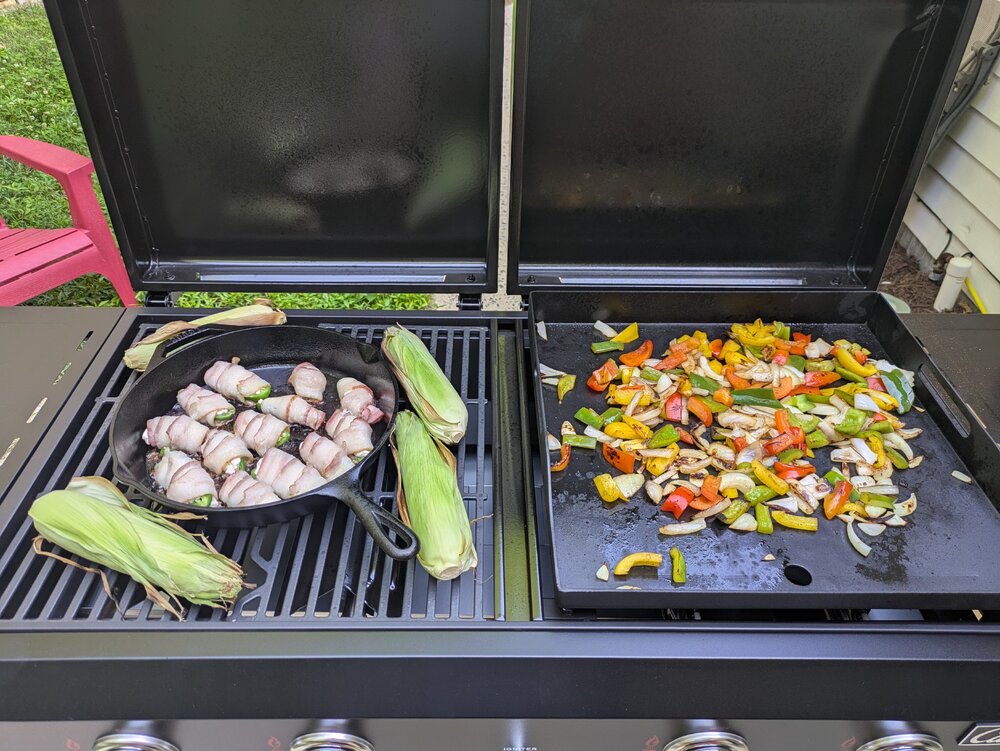 Jalapeno boats, corn on the grill. Peppers and onions on the flat. Steaks and salmon next up