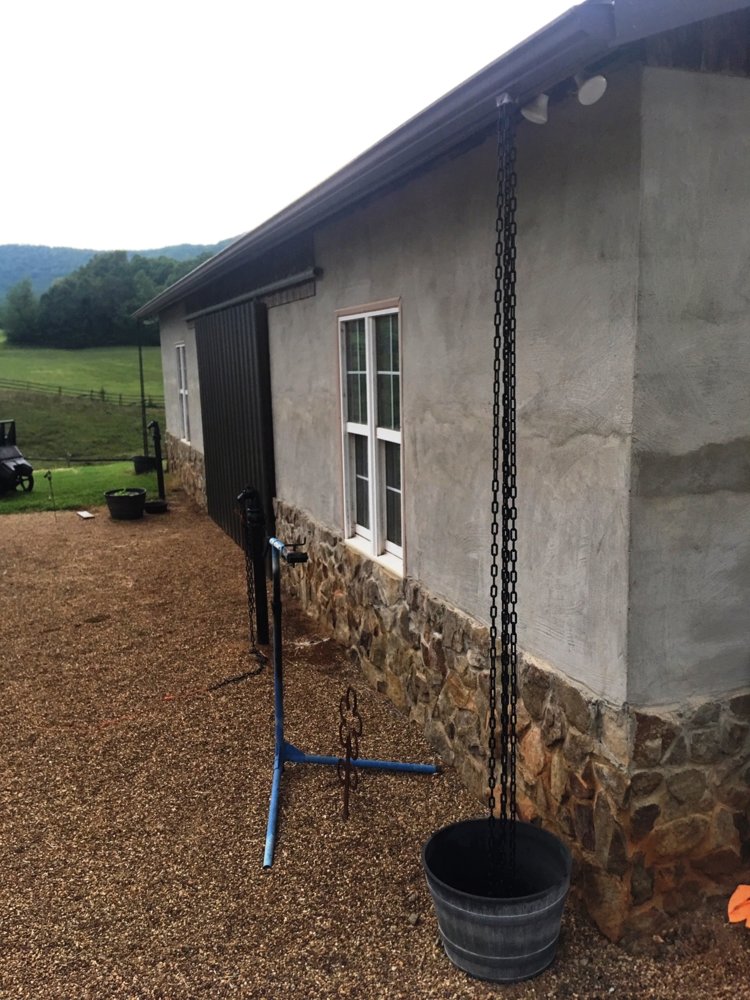 If your catch drains don't collect enough of the water from the down spouts, one option would be something to do something like we did for the barn.