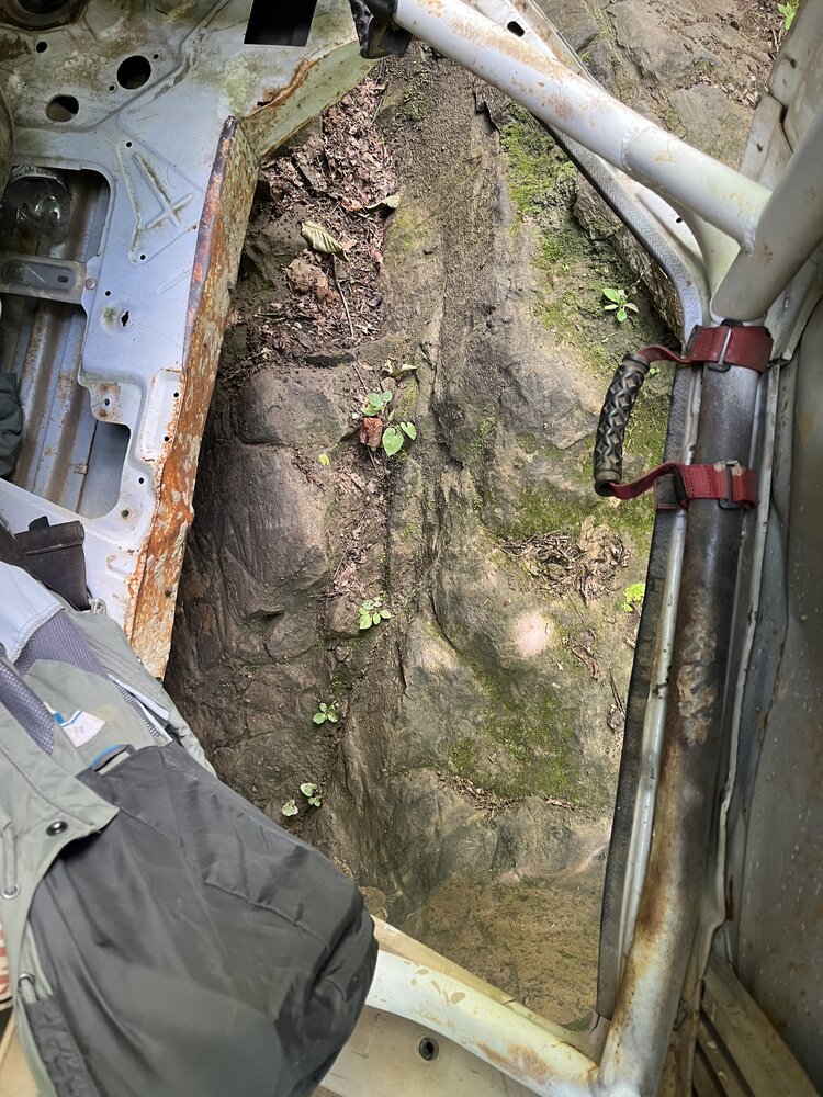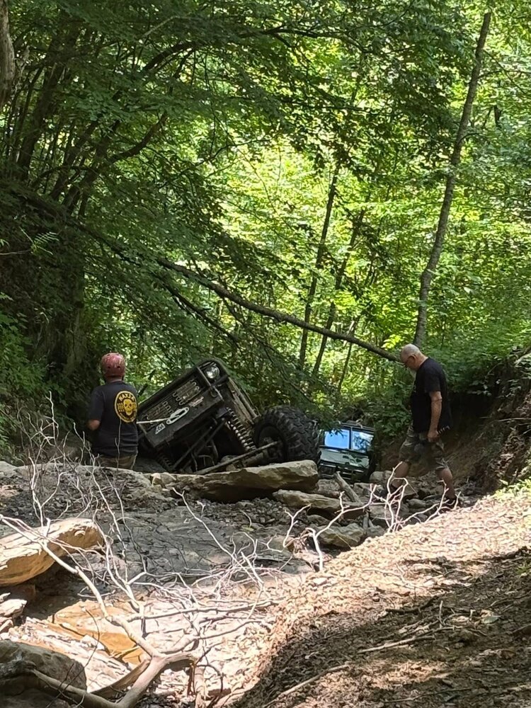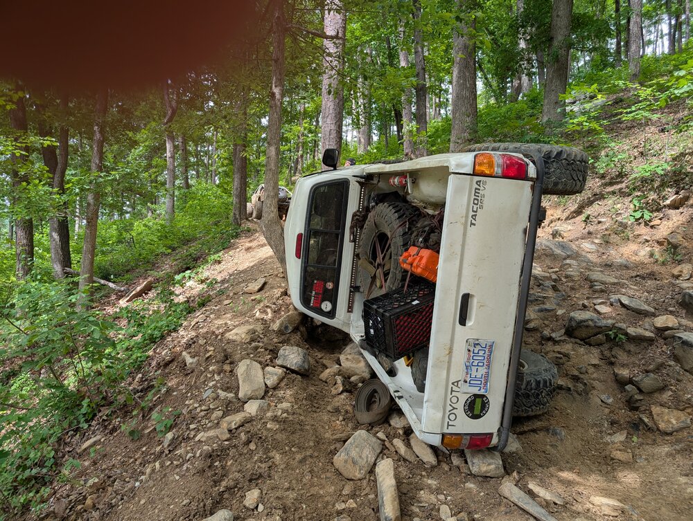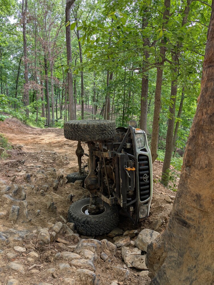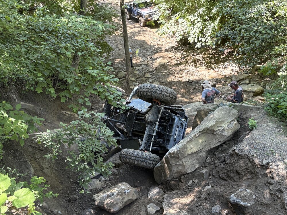 So she was sort of on her side today. First ledge on Lower Damnation. Needed @Jody Treadway winch but since he wasn’t around I used mine. I winched up the fist ledge because I couldn’t get my tires even on it 40” I’d guess. So while maneuvering for the second I dropped off the first. Son of a bitch.