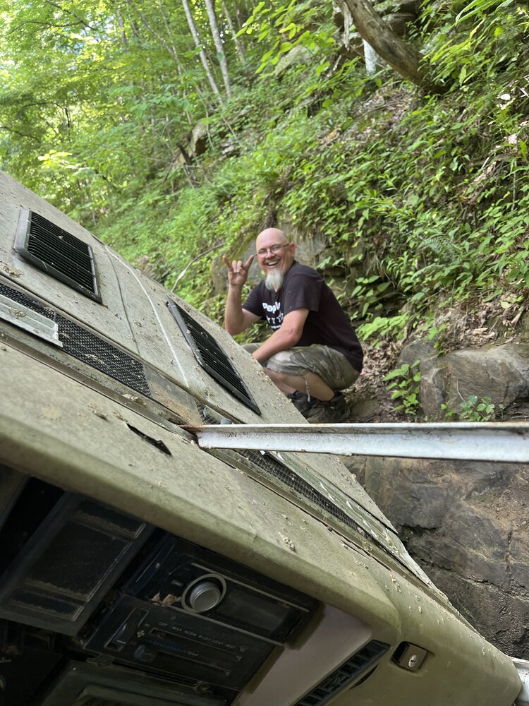 Back up and bump.... Doesn't always go as planned. passenger side floor mat, coffee cup, lighter ciggs, was all that hit the ground. The guy in the hat, just so happen to be local, to me, from Marion location. It took him and George to get me out. No injuries, minimal body damage. Pull plugs, push out the oil, and all was good, mostly. Great trip with a couple good friends. Several smallish issues, my day stopped Saturday due to PS pump going out. All and all, it was a great trip.