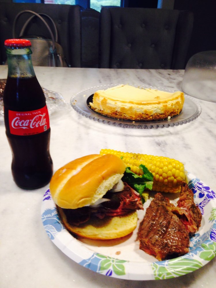 Leftover birfday steak sandwich with some garlic aioli spread on a sweet Hawaiian bun and of course a glass bottle coke compliments of my buddy @Atla. Homemade cheesecake waiting in the background.