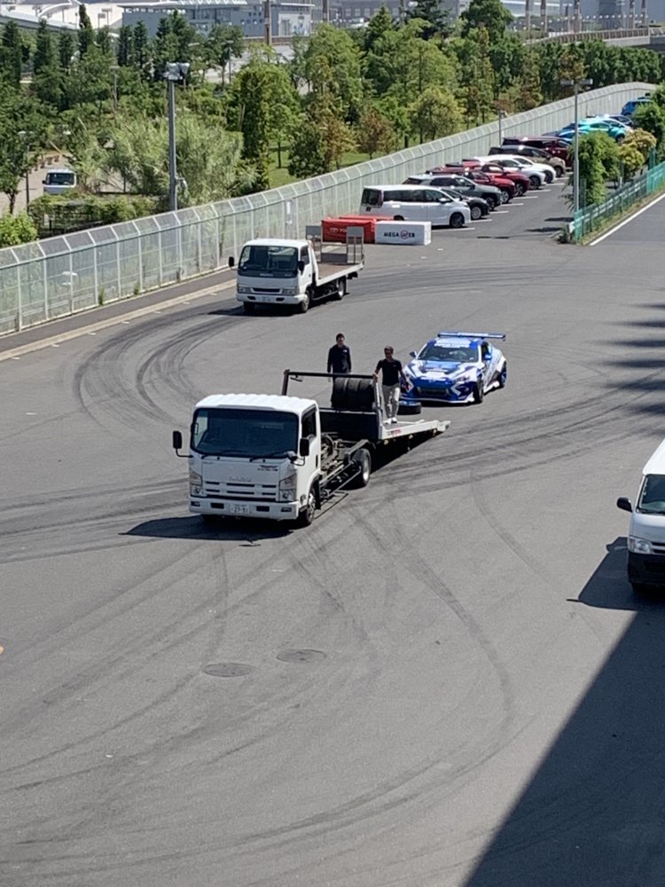 Unloading the race car in preparation for opening. Notice the tire marks