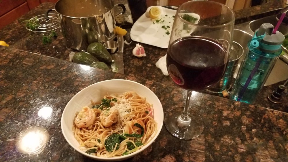 You should be giving her a "good game" to make this a proper internet pic.Super-fine wife fixin shrimp, spinach, and whole wheat noodles
