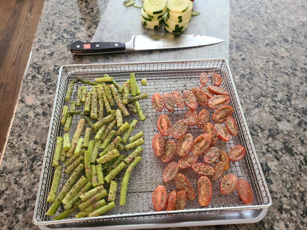 Bone-in BBQ chicken breast in sous vide, baked tater in the air fryer. Gotta find a green veggie.