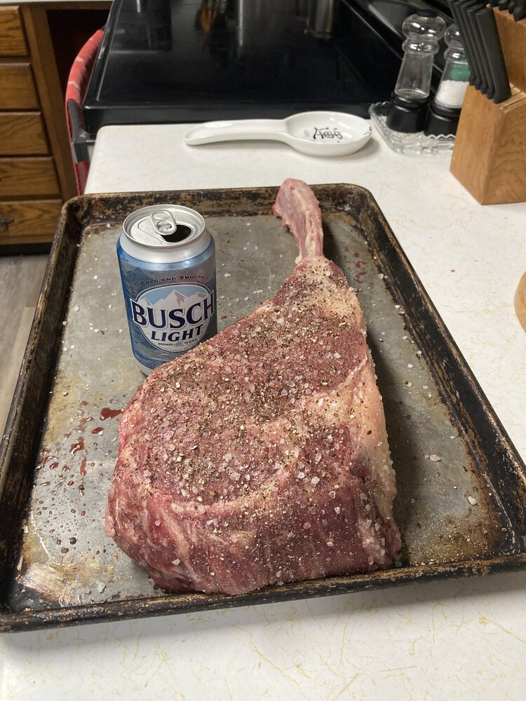 I wanna make a joke about that $$$$$ steak and that cheap beer… but that’s what’s in my fridge too lol4.5 lb. Wagyu Tomahawk prepping for this evening supper! Hope it was worth the price..