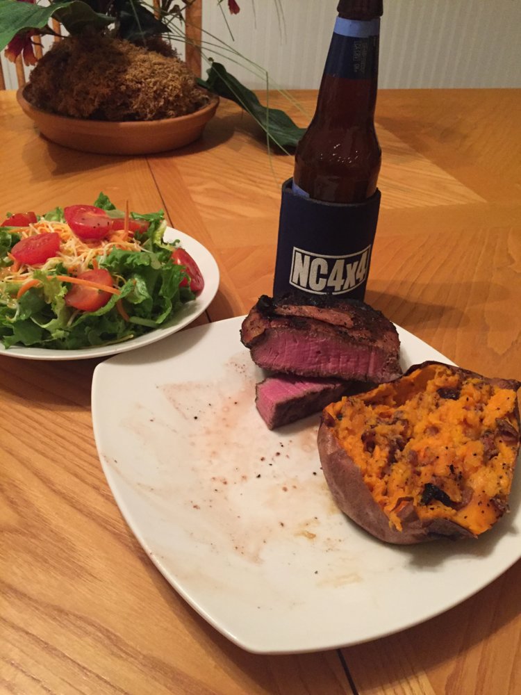 Medium rare, bacon wrapped filet cooked over charcoal and white oak, baked sweet potato with salt, pepper, grilled bacon & some butter, green leaf lettuce salad, and a Sam Adams Cold Snap.
