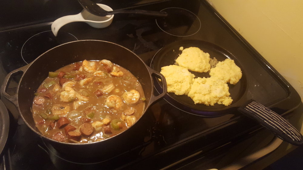 New Orleans style Creole shrimp and andouille over grilled cheese grit cakes...