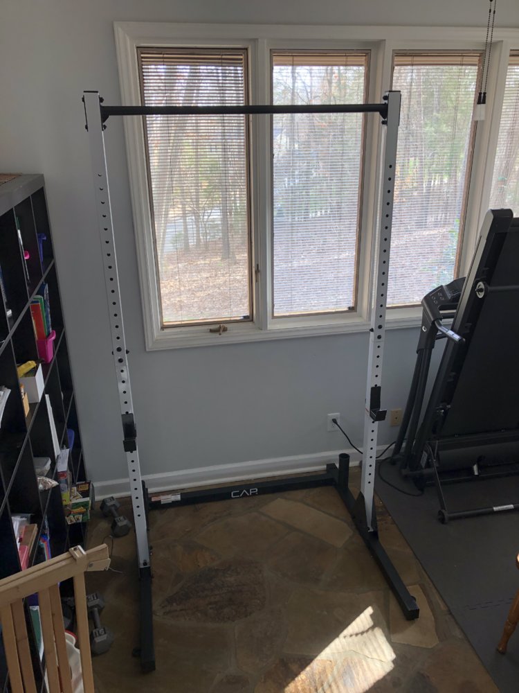 I’ve been under the weather this week, so I haven’t done much. But I did get this pull-up bar. I know I could have gotten out cheaper hanging a bar in the garage, but I knew if I had to walk down the stairs just to do pull-ups, I probably wouldn’t. Where it’s at, I pass it every time I walk from the living room to the kitchen, so I can just do some every time I pass it.