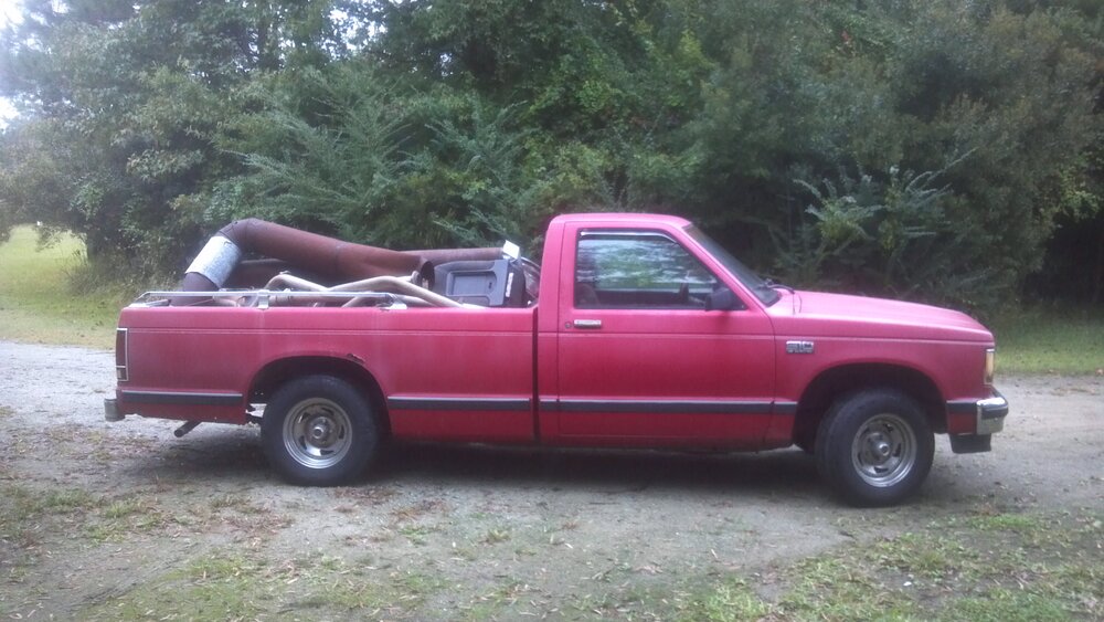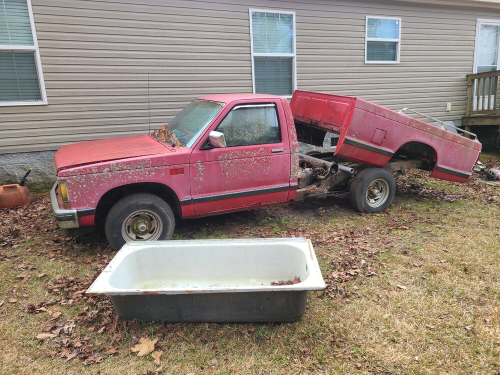 I got home from work the other night and had the notion to get my old S10 back on the road. It's been sitting for a few years, but I knew the old Iron Duke would fire up. So, ran over to the shop and while rebuilding/cleaning the carburetor on my lawnmower, I put a battery on charge to drop in the Super 10. Got back to the house and tried to fire it up. Just as I suspected, the fuel pump was dead....not surprised. Pulled the bed off and slid it back and the tank is getting tossed as well. It has a 13 gallon tank, but all the replacements are a 20 gallon which conveniently uses the same straps as the 13 gallon. It's just longer in the front and goes up under the cab a little bit. I'd rather have the bigger tank anyway.