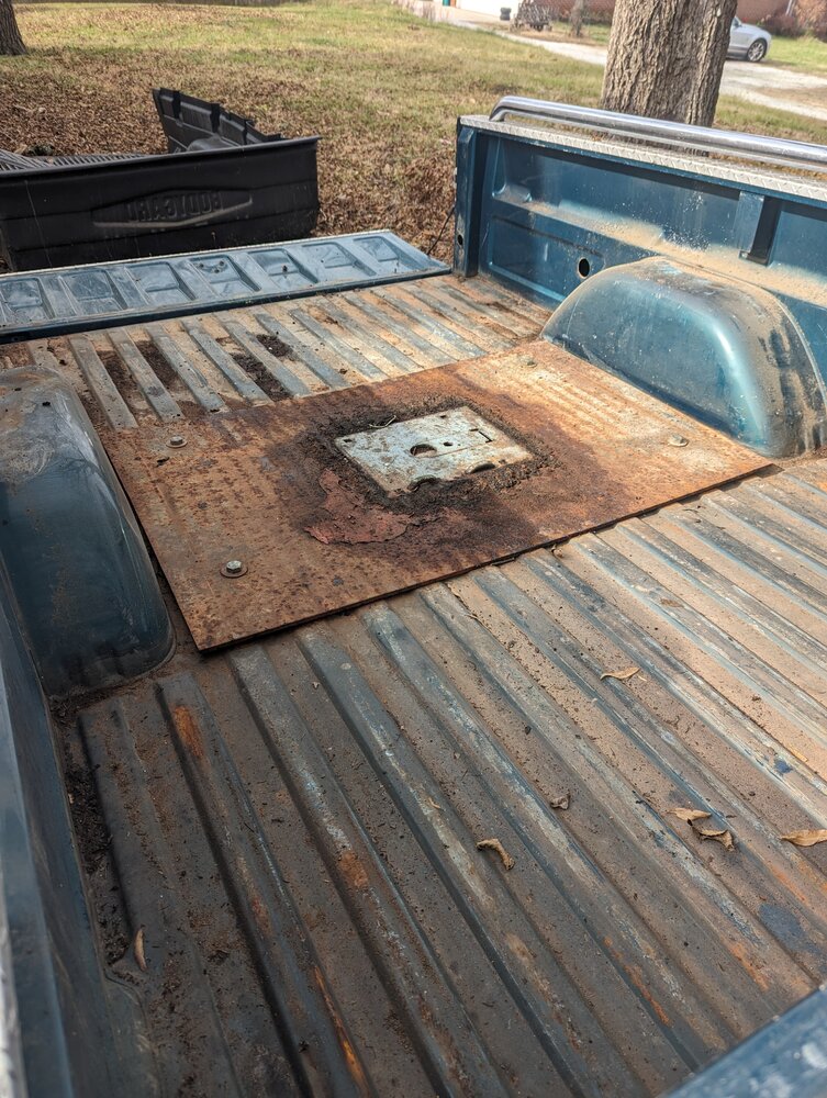 Update, got the plate pulled and sold. Bed is luckily in good shape underneath; some caked on dirt and a few other holes but nothing that can't be cleaned. Going to cut some chunks out of the other bed for patch panels and probably do up the bed with Herculiner or Rust-Oleum bed liner to hide some of the body work