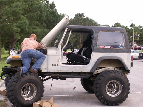 On Saturday (race day), it was decent weather in the morning, but they were calling for thunderstorms and possible tornadoes that night. Sweet! add an additional degree of challenge to the event. As usual, I spent my Saturday morning down at the auto hobby shop on base, checking things over, making sure nothing was out of sorts or loose, checking fluids, and some general tinkering here and there. It was early afternoon by this point, and I wanted to get my Jeep strapped down to the trailer, head up to Washington just north of New Bern to a gas station right off of 17 that sold 110 octane so I could make sure I had plenty of fuel to burn. I hopped up in the driver's seat, pumped the go-pedal once, flipped the ignition switch and pressed the start button.