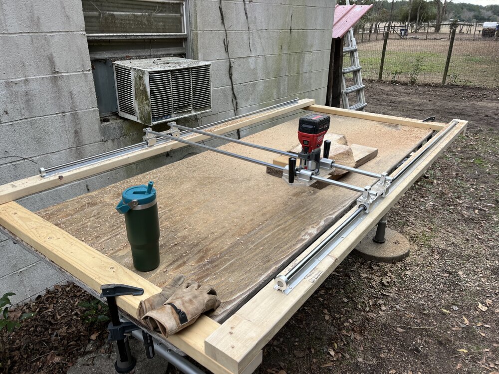 Got a nice day and no rain so I got the slab mill out to test it out. This red oak would stall the router if I took too deep of a pass. When the battery died I realized that was why. Fresh battery and she worked great. First observation is it’s too high above the table so I’ll have to swap the cross pieces from bottom to top. At this height I believe it would only work well with pieces 3” - 4” thick.